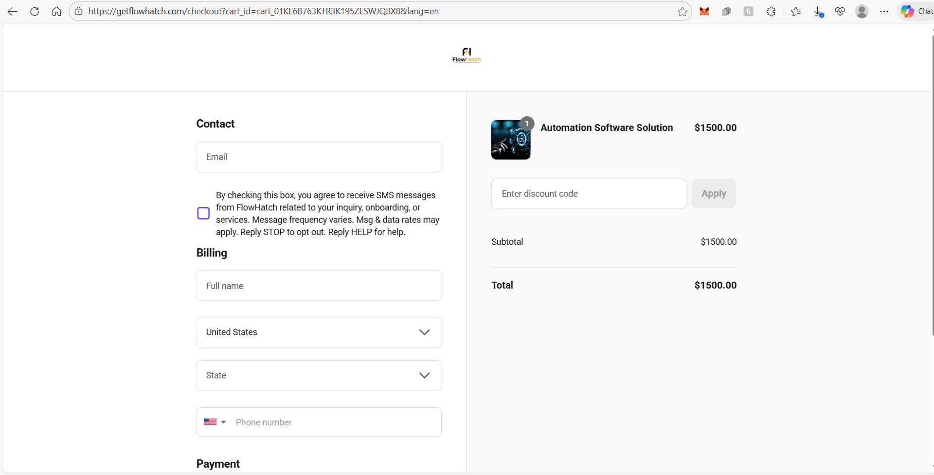 “By checking this box, you agree to receive SMS messages from FlowHatch related to your inquiry, onboarding, or services. Message frequency varies. Msg & data rates may apply. Reply STOP to opt out. Reply HELP for help.”
